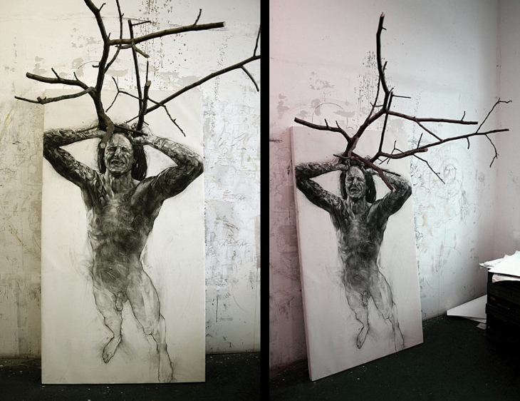 Em seus desenhos são usados técnicas que imitam um 3D, com a utilização de galhos de árvores reais, compostos de maneira que interagem com o desenho.
