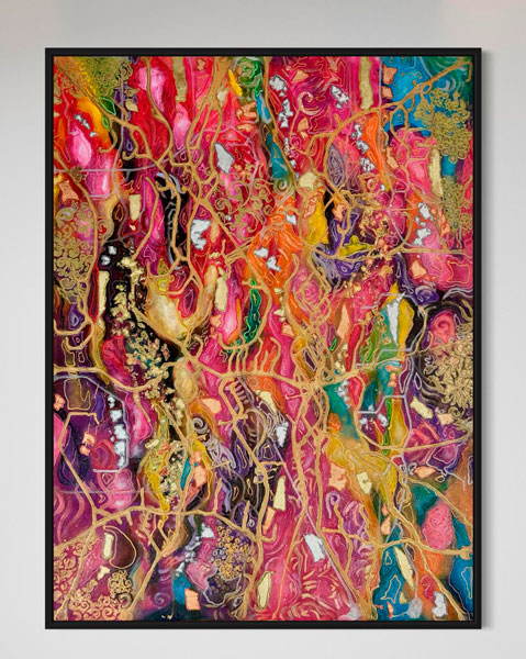 A mostra apresenta uma seleção inédita de pinturas e relevos texturizados, desenvolvidos com pigmentos metálicos, tintas iridescentes e elementos naturais aplicados sobre superfícies densas, em composições que evocam mapas neurais, grades urbanas, raízes em decomposição e camadas geológicas.