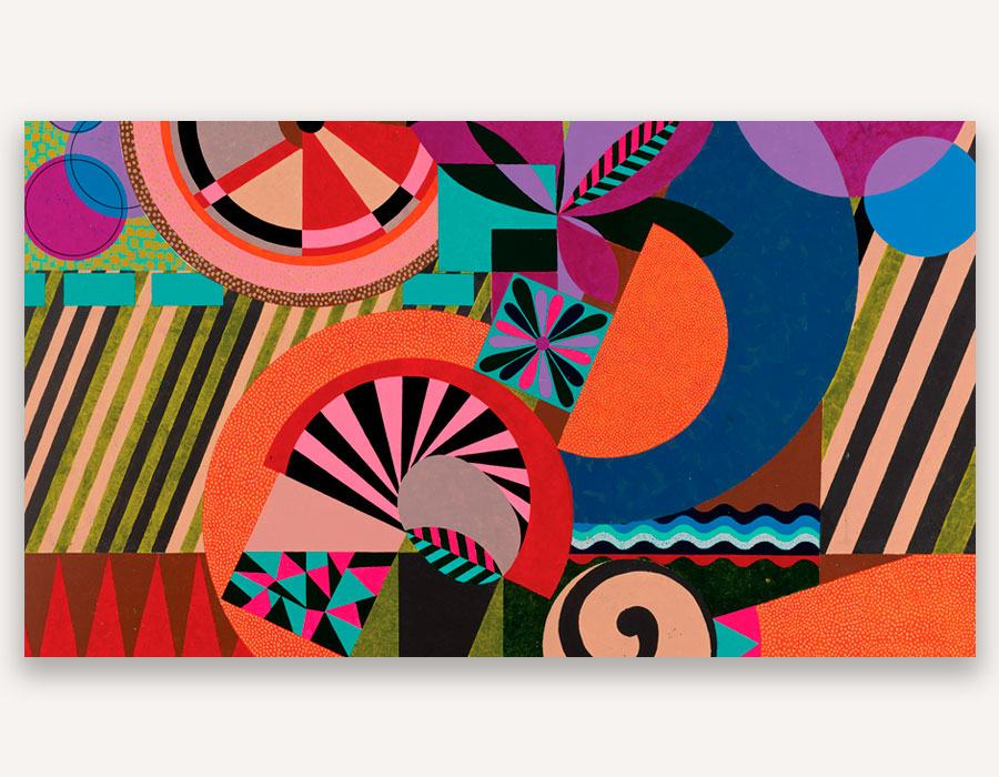 A artista apresenta um novo vitral concebido para as janelas da instituição, no qual seus padrões característicos são aplicados em filmes translúcidos multicoloridos que filtram a luz solar e projetam feixes caleidoscópicos pelo espaço expositivo. Também em exibição está A Seda, obra emblemática de sua produção dos anos 2000, na qual elementos gráficos em cores vibrantes se expandem do centro da tela em movimento centrífugo. No núcleo, um emaranhado de arabescos rendados forma o coração da composição, combinando fluidez e ordem em uma estrutura orgânica em expansão. Já em trabalhos mais recentes, como Memórias do Futuro II (2023), a artista sobrepõe grafismos feitos com caneta de tinta acrílica (marcadores Molotow) às formas transferidas por sua técnica de monotransfer, acrescentando uma nova camada de padrões ao intrincado jogo de tramas em rotação e criando estratos que se articulam em uma rede complexa e multidirecional.