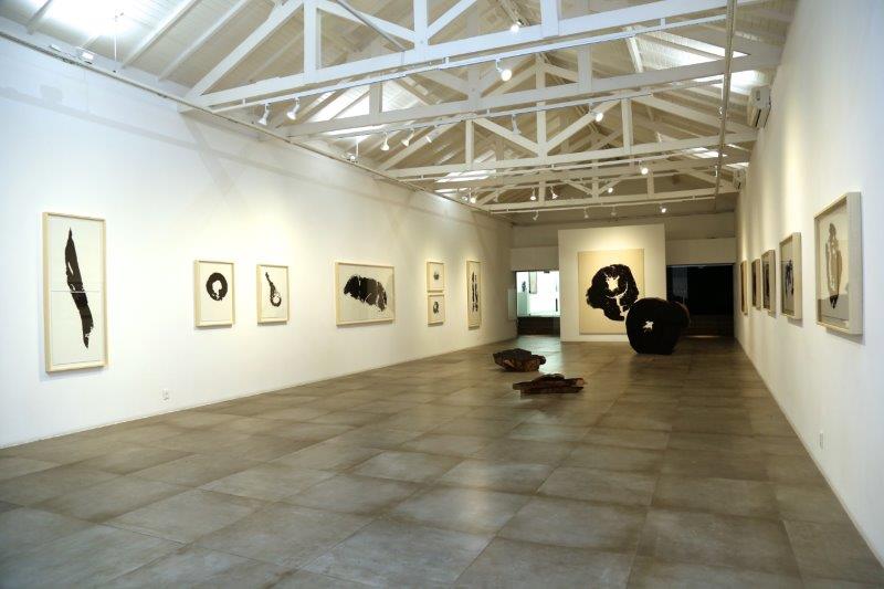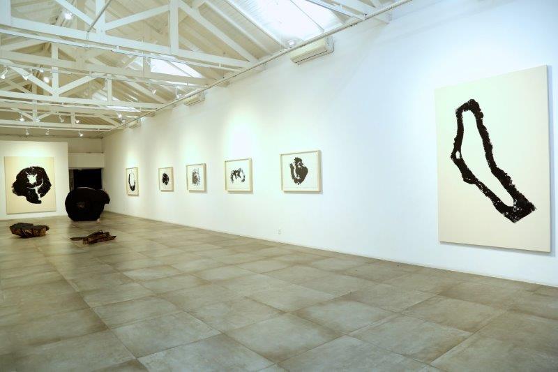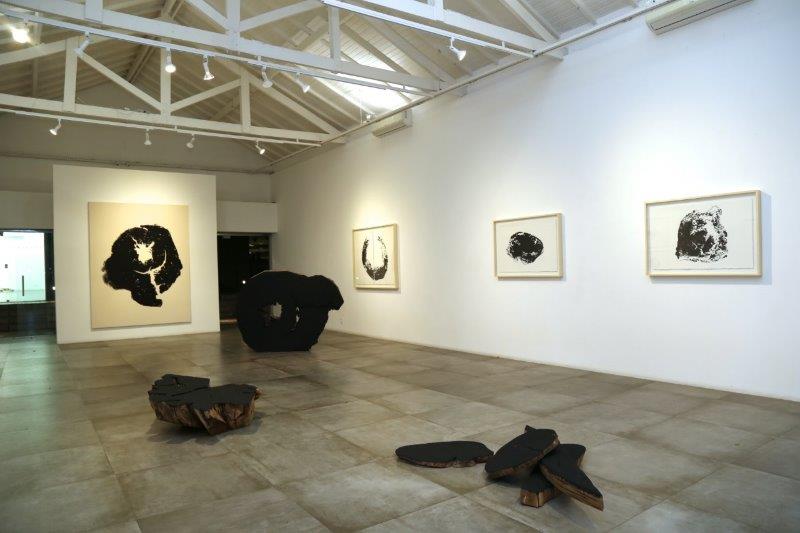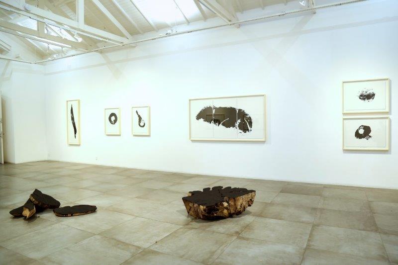 Meses depois, um caminho foi encontrado. Com matrizes feitas de pedaços de troncos, fatias e blocos saídos da produção de suas esculturas mobiliárias e uma mistura de carvão vegetal e verniz, iniciou-se uma produção de monotipias, registros íntimos do corpo e da textura da estrutura lenhosa das árvores. “Apesar de, pela primeira vez, me dedicar a um trabalho no plano bidimensional, não sinto que me afastei da minha poética porque a madeira, o carvão e o verniz são materiais que me acompanham desde o início de minha carreira”, completou Hugo.