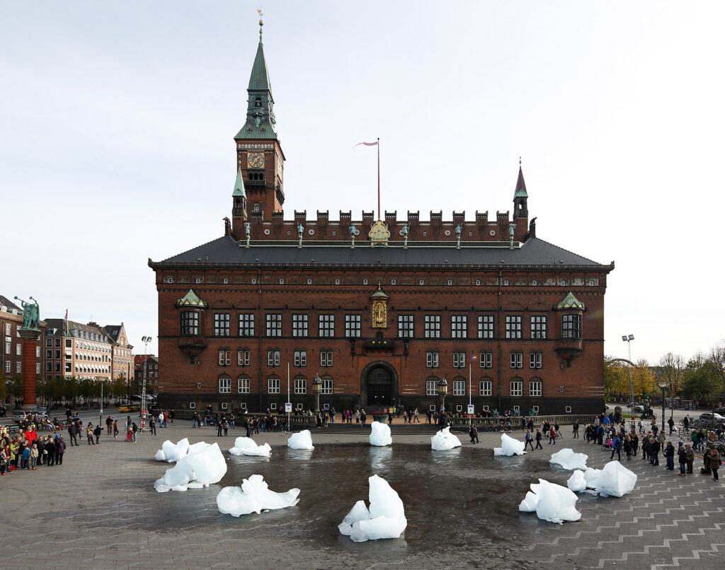 Um exemplo emblemático é o projeto “Ice Watch” (2014–2018), do artista dinamarquês Olafur Eliasson, que transportou blocos de gelo da Groenlândia para praças públicas em cidades como Copenhague, Paris e Londres. Ao permitir que o gelo derretesse diante dos transeuntes, a instalação transformou o fenômeno distante do degelo polar numa experiência sensorial e urgente, conectando estética e ação ambiental.