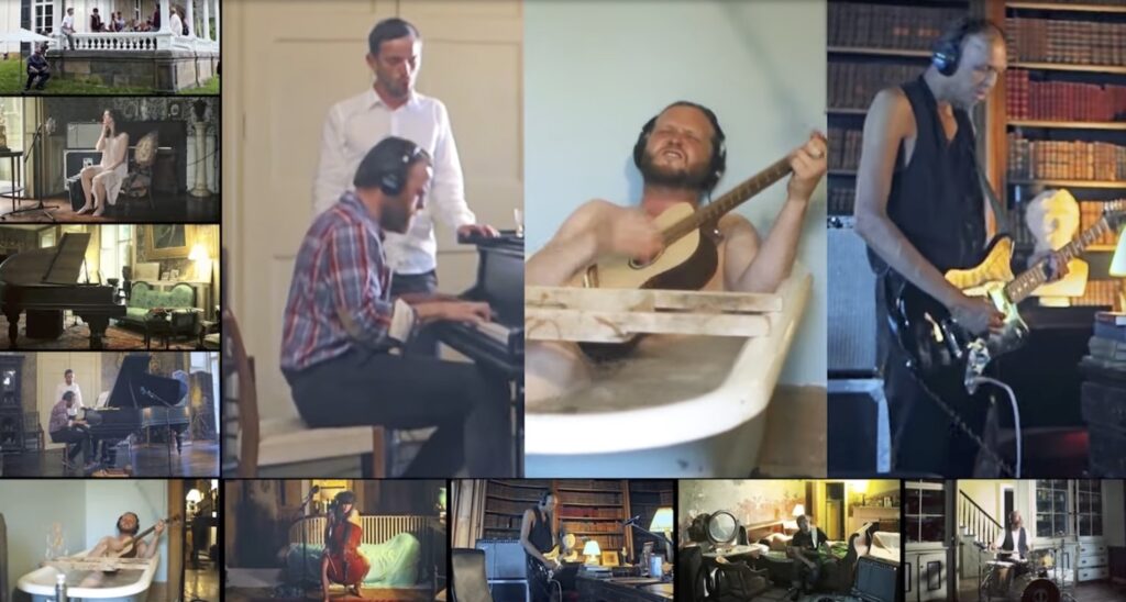 Um exemplo notável é o trabalho do artista islandês Ragnar Kjartansson, cuja instalação performática The Visitors (2012) reúne músicos tocando isoladamente em diferentes cômodos de uma casa, conectados apenas pela música. A obra é ao mesmo tempo profundamente emotiva e consciente de sua própria teatralidade, capturando o espírito metamoderno de unir o sublime e o autocomentário numa mesma experiência.
