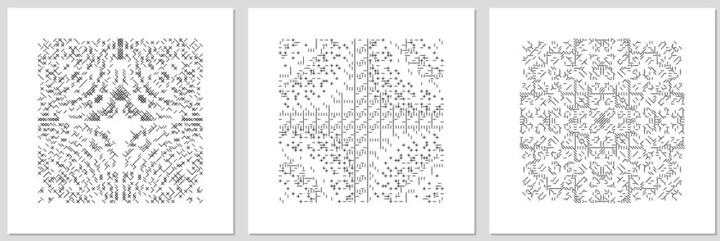 Um exemplo marcante é o projeto Autoglyphs (2019), criado pelo coletivo Larva Labs. Trata-se de uma série de obras geradas inteiramente on-chain — o código que as produz está gravado permanentemente na blockchain, sem depender de arquivos externos. Cada peça é única, autossuficiente e aberta à consulta pública, transformando a própria lógica do registro digital em um gesto estético.